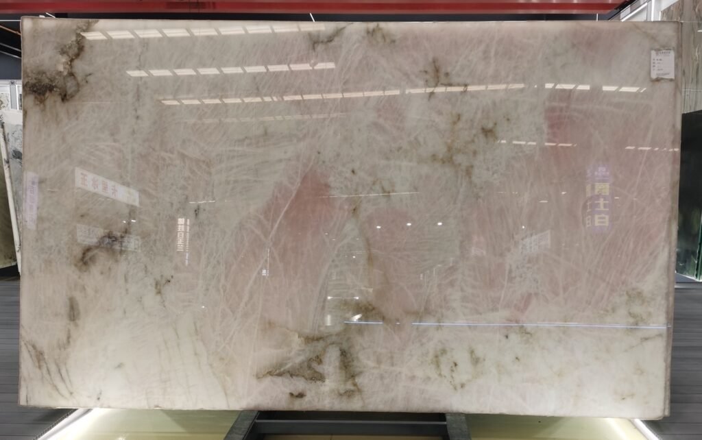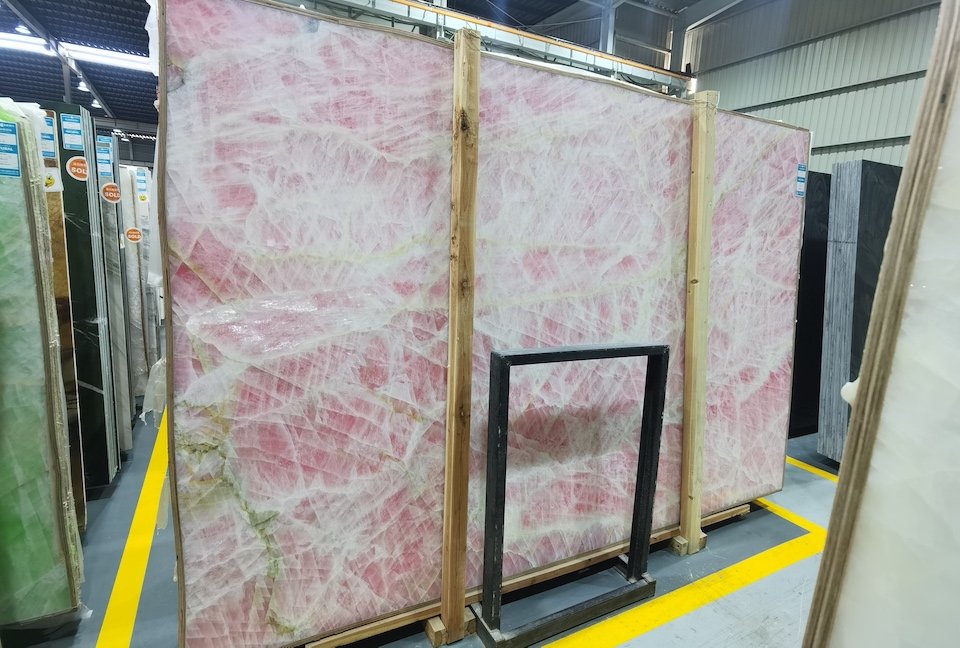 This material is produced by applying pink‑colored marble glue to the back of white Cristallo natural stone slabs. When viewed from the front, especially under backlighting, the stone appears pink.